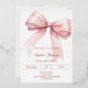 A white background, decorated with a pink large bow. Personalize and add a name and party details. Rose gold foil.