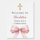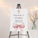 A large pink bow and a golden cross as decoration. Personalize and add her name.
