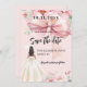 An elegant blush pink background, decorated with a large pink bow, pink flowers and a girl in a cream colored dress. Personalize and add a name and details.