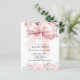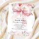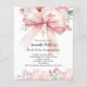 A white background, decorated with a pink large bow and, a golden cross and pink flowers. Personalize and add a name and details details.
