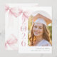 An elegant graduation announcement featuring a soft pink bow and refined typography, designed to share this special milestone with family and friends. This coquette-inspired design blends timeless elegance with a feminine, modern touch, making it perfect for announcing a graduation in a stylish and memorable way. Ideal for both high school and college graduates who love classic details with a chic aesthetic.