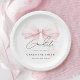 Stylish paper plates featuring a soft pink bow design, created to complement an elegant coquette graduation theme. Perfect for serving cake, desserts, or light bites while maintaining a cohesive, feminine, and sophisticated party table setup.