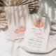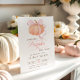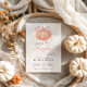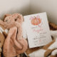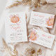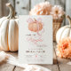 A sweet baby girl shower invitation featuring a soft pastel pumpkin topped with a pink coquette bow. Designed with elegant calligraphy and a minimalist layout for a chic fall celebration.