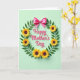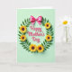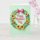 This card features a circular wreath of slender green leaves that curl and overlap like a gentle hug around the center message. In the middle, the text “Happy Mother’s Day” sits prominently in soft pink lettering, with rounded, flowing shapes that feel tender and affectionate ❤️. Six sunny yellow flowers are spaced around the ring, each with a deep, dark center that draws the eye like a warm, steady gaze. At the top of the wreath, a satin-like pink bow with smooth loops adds a dressed-up touch, like a small gift tied with care. The background is a calm pastel mint green, letting the pink and yellow details stand out without feeling harsh. The lighting is soft and diffused, giving the leaves, flowers, and raised-looking letters a gentle sense of depth 🌼. The pink bow sits centered above the wreath, and the yellow flowers appear evenly distributed around the leafy circle.