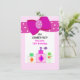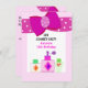 A stylish spa party invitation. Lotions and perfume bottles in pretty colors. A pretty pink bow across the top of invitation. Customize with all of your party information as desired.