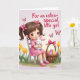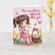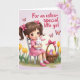Designed with a sweet spring scene, this card features a young girl with dark, shining eyes and rosy cheeks as the main focus. Her brown hair is styled in pigtails with bright pink bows, matching her pink dress with delicate trim, and she sits on a simple gray chair while cuddling a soft white bunny 🐰. The gentle way she holds the bunny, and the calm tilt of her face toward it, adds a tender, affectionate tone to the moment. To her right, a woven basket tied with a pink bow is filled with pastel eggs in lavender, pale yellow, and rosy pink, hinting at a festive Easter morning. Along the bottom, yellow tulips and green leaves frame the scene like a garden border, adding a fresh spring touch 🌷. Near the top, the message “For an extra-special little girl” appears in warm fuchsia lettering, centered and easy to spot against the light pink background. Above the text, patterned butterflies drift across a softly shaded pink sky, with their wings detailed in small decorative shapes for a light, airy finish. Share Easter sentiments with someone special this season.