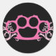 These t-shirts and other items are printed with a retro image of an outline of brass knuckles and decorative swirls in pink.