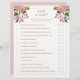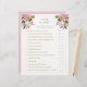Romantic pink and white painted florals bridal shower game with gold text.