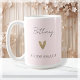Looking for the perfect bridesmaid gift to show your appreciation for your best gal pals? Look no further than our modern gold heart coffee mugs! Featuring an elegant font that spells out "Bridesmaid" and your friend's name in modern script on a blush pink background, this coffee mug is the ideal way to thank your bridesmaids for being by your side on your special day. Whether you're planning a bachelorette party or simply want to give a thoughtful and personalized gift, our coffee mugs are the perfect choice.