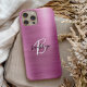 This elegant personalized phone case features a monogram and first name in modern black and white script on a trendy pink brushed metal background.