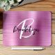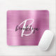 This elegant personalized mouse pad features a monogram and first name in modern black and white script on a trendy pink brushed metal background.