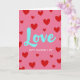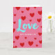 This greeting card features a rosy pink background covered with red hearts in different sizes, scattered all over like confetti. In the center, the word “Love” is written large in aqua blue with a brush-painted look and slightly rough edges. The letters have gentle curves that make the word feel warm and romantic, and it stands out clearly against the pink. Just below it, the text “HAPPY VALENTINE’S DAY” appears in small white sans-serif letters, centered and easy to read. The hearts tilt in different directions, which adds a light sense of movement without feeling busy. Overall, the mix of pink, red, and aqua gives the card a sweet, friendly Valentine’s Day feel 💕❤️.