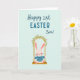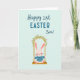 This card features a sweet, stylized bunny-like creature in soft pink tones, with long ears and a bright, friendly gaze 🐰. It sits on a small swing with a light wooden seat, held by two golden chains that drop from above. Curving over the top is a garland of green leaves dotted with tiny pink blossoms, like a spring canopy that frames the scene 🌷. The background is a pale aquamarine wash, letting the gentle pastels stand out without feeling loud. Across the upper area, the text is arranged in three parts: “Happy 1st” near the top, “EASTER” centered beneath it in thicker, simple lettering, and “Son!” placed nearby to balance the layout. The lettering uses a mix of smooth, flowing strokes for “Happy 1st” and “Son!” and more straightforward, heavier lines for “EASTER,” all in coordinating dark ink for easy reading. The little character’s relaxed posture and slight tilt of the head suggest a fond, affectionate moment, as if it’s swinging just for someone special. Small pink blossoms cluster along the leafy arch while the golden chains hang straight down to the swing seat.