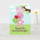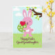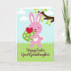 Designed with a soft pastel look, this card features a long-eared bunny-like character in gentle pink, standing upright on a bright green hill and hugging a large egg. The character’s tiny dark nose and dot eyes give it a sweet, shy expression, like it’s holding the egg close for a friend or someone special 🐰. The egg is pale with white polka dots and a clear red heart on the front, making the embrace feel tender and affectionate. In the upper right, a curving branch stretches into the scene with small white blossoms and sunny yellow centers, adding a springtime touch 🌷. Rounded clouds float across a light blue sky, keeping the background airy and calm. Near the bottom, a seasonal greeting appears in flowing dark lettering centered along the lower edge, sitting just above the grass line. Small pink star-shaped accents are scattered across the foreground, and the branch’s blossoms cluster most densely near the top right corner.