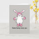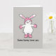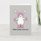 This card features a plump white bunny standing in the center on a smooth, plain gray background 🐰. Thick black outlines define its rounded shape, and its tiny dot eyes, small smile, and rosy cheeks give it a tender, friendly look, like it’s leaning into a cuddle. The bunny wears soft pink accessories—a snug beanie, matching mittens, and rounded boots—and its long upright ears show the same blush tone on the inner parts 🐇. With arms stretched wide, the pose reads like an open invitation, the kind you’d share with a close friend or someone you’re sweet on. Beneath the bunny, a casual handwritten-style line of text sits centered near the bottom in black and reads, “Some bunny loves you.” The limited palette keeps the focus on the gentle contrast between white fur, pink accents, and the quiet gray backdrop. A small fluffy white tail peeks out at the side, and the pink mittens sit at the ends of the outstretched arms.