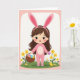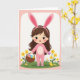 This card shows a cheerful child in a soft pink, full-body bunny outfit 🐰, with long upright ears framing her wide-eyed face and an open smile that feels like it’s meant for a close friend standing just off to the side. She stands against a white background, surrounded by a rounded pale-pink border that gives the scene a gentle, storybook look. In her right hand, she holds a rustic woven basket filled with decorated oval eggs in spring shades of blue, orange, green, and yellow. Her left hand cradles a single smooth purple egg, held close in a way that suggests she’s about to share it with someone special 🐇. Along the bottom, a patch of green grass spreads across the foreground, dotted with small yellow blossoms like tiny gifts scattered for two. Near her feet, a small yellow chick stands beside her, angled toward her as if waiting for attention. The greeting text sits near the top in a soft pastel tone, with the rounded pink border enclosing the white center and the grassy strip anchoring the lower edge.