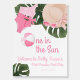 This welcome sign features a pink swimsuit and summer hat on tropical monstera leaves. Text reads "one in the sun" with a beach ball as the letter "O". All the details of the event can be edited to meet your needs.
