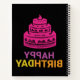 A stylish, spiral-bound notebook with a black cover features a vivid pink birthday cake graphic and bold, gradient "Happy Birthday" text. Ideal for gifts, journaling, and festive celebrations.