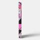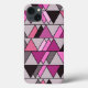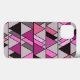 This phone case has a mid-century modern design of overlapping triangles running horizontally in pink camo colors on a field of light gray.