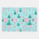 Pink pastel colorful holiday wrapping paper with cute items such as candy canes, stockings and presents on blue and teal backgrounds.