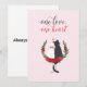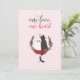 Two cats—black and white—sit entwined, tails forming a heart, framed by red roses and green leaves. Set against a soft pink backdrop, this romantic card celebrates unity and love. Inspired by soulmates, it’s perfect for Valentine’s Day or anniversaries. Give love that lasts.