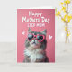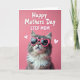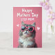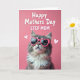 This card features a vertical layout with a grey-and-white striped cat centered in the lower portion against a sugary pink background, giving the scene a cozy, affectionate feel ❤️. The cat wears glossy, heart-shaped sunglasses in a bright pink tone, and its head tilts slightly upward as if gazing at someone it trusts. Soft, even lighting highlights the plush fur and adds a gentle glow that feels friendly and close. A fluffy white ruff circles the cat’s neck, creating a sweet contrast against the smooth pink backdrop. Near the top, rounded white lettering reads “Happy Mothers Day STEP MOM,” set in a neat line that stands out clearly. Two small pale-pink heart icons sit near the text, adding a quiet romantic touch without crowding the design 🌼. The heart-shaped glasses show a shiny mirrored look, with the frames sitting snugly across the cat’s face.