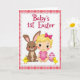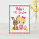 This greeting card features a digital illustration centered on a white rectangular panel surrounded by a pink checkerboard frame in several soft shades. Inside the panel, a fair-haired baby sits in pink clothing with a matching bow, looking outward with big dark eyes, rosy cheeks, and tiny lashes that give a gentle, affectionate expression. Next to the baby is a brown long-eared bunny 🐰 with pale pink inner ears and a fluffy white tail, angled slightly toward the child as if keeping close company. Two small yellow chicks stand to the left and right, their positions balancing the scene like friendly little companions. Near the baby rests a striped egg in layered pink tones, adding a seasonal detail without crowding the space. At the top of the white panel, the words “1st Easter” appear in a thin, flowing dark-gray style, centered above the characters. A dotted border traces around the main panel, and the outer frame alternates light and medium pink squares with a few tiny accents, with a small 🌷 tucked near one corner.