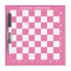 Pink chess board game dry erase panel for lessons. Cool gift idea for chess player, school, teacher, instructor, coach, friend, kids, co worker, boss, etc. Draw out instructions, tactics and strategies to improve your game. Customizable background color. Add your own name, logo or quote. Unique Birthday presents for him or her. Also good for checkers and other games. Hang up on the wall or board with magnetic strips, foam adhesives or just use as a stand up on a ledge. Includes black marker. Gray and white checkered design with 64 squares. Includes numbers and letters. Simply draw out your chess pieces. Fun novelty game display for home, club, office, event, wedding and more. Pink or custom color.