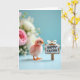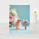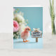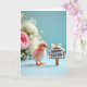 Designed with a tiny fluffy chick in soft coral-pink as the main focus, the scene feels gentle and close-up, like a small moment shared between friends. The chick stands on a powder-blue surface near the bottom of the card, leaning slightly toward a rustic wooden sign as if drawn to it with curious affection 🐰. In the upper left, softly blurred pastel flowers add a springtime backdrop without stealing attention from the pair. Light falls in a diffused way, creating mild shadows under the chick and sign and keeping everything calm and airy. The chick’s orange beak and legs pop against the pale colors, and its deep blue eyes and head tilt give it an attentive, tender look 🐇. A short celebratory message sits on the wooden sign in simple lettering, with the text centered and easy to read against the weathered wood. A thin cream ribbon is tied to the sign, and the surrounding palette stays mostly light blue, blush pink, and creamy white with the floral blur tucked into the top-left corner.