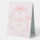 A pretty pink bow surrounds your elegant confirmation table number table tent sign for your little girl's party. A beautiful Christian cross is above the custom script for your confirmation celebration or baptism. Lovely religious ribbon decor for your Catholic ceremony.