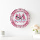 This image displays a circular, three-dimensional decorative design with a bright, festive holiday theme. The center features four stylized pink Christmas trees, each adorned with distinct patterns like polka dots, zigzags, and small ornaments. The phrase "Merry & Bright" is written below the trees in pink script. This central scene is enclosed by a highly dimensional pink border, detailed with white and pink snowflakes and polka dots. The overall aesthetic is cheerful, using pink, white, and red as the dominant colors.