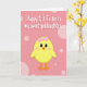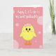This card shows a round little baby bird in bright yellow sitting near the lower center, with wide black eyes, rosy cheeks, and a small orange triangle beak that gives it a sweet, friendly look 🐰. A pink bow on its head adds a gentle, affectionate touch, like it’s dressed up for someone special. The background is a muted rose tone filled with soft, see-through lighter pink circles in different sizes, creating a floating, bubbly setting 🌷. Across the upper area, the message is set in rounded white lettering with a slight raised look, standing out clearly against the pink. The text reads, “Happy 1st Easter to my sweet goddaughter...” and it’s placed high enough to leave the character as the main focus below. The roomy spacing between the words and the character makes the scene feel calm, like a quiet moment of closeness shared at a celebration. Behind the bird, the pale pink circles drift across the rose backdrop, with the largest ones scattered near the top and smaller ones sprinkled around the middle.