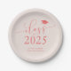 Simple and elegant graduation party plate featuring typography text that says "class of 2025" in script font with a graduation cap illustration. The background is pink.