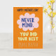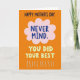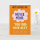 The front design shows a solid orange background that feels like a sunny stage for friendly, flirty words ❤️. Across the top, a short celebratory line sits centered in dark blue lettering, setting an upbeat tone. In the middle, a soft pink, cloud-like shape holds a punchy phrase in deep blue, like a teasing aside shared between close friends. Just below, a larger line in bright chartreuse stretches across the center, its rounded letters giving the message a warm, appreciative feel 🌼. The mix of orange, pink, blue, and chartreuse keeps the layout lively while the smooth, rounded letterforms make it feel approachable. Spacing between the lines is generous, so each phrase lands clearly without crowding the next. Along the bottom edge, thin pale-blue vertical strokes—some slightly curved—rise like quick doodle marks against the orange field.