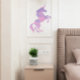 Fill your own or a child's imagination with this colorful unicorn wall decal that features the soft colors of a pink, wispy cloud filled sky. Mirror image also available in store to create a matching, opposing set.