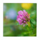 A closeup view of a pink clover flower against smooth multicolor background of a summer meadow. Purple, green, yellow and blue colors. The symbol of good life, comfort, wealth and prosperity