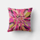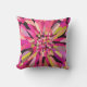 This throw pillow features an abstract flower in shades of pink, red, orange, purple, chartreuse, olive green, wine and lavender on a black background.
