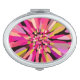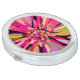 An abstract flower in shades of pink, red, orange, purple, chartreuse, olive green, wine and lavender on a black background.