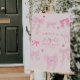 Cute bow theme birthday party welcome sign featuring hand drawn illustration of pink coquette ribbons with hearts.