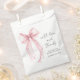 Elegant bridal shower thank you favor bags featuring a light pink watercolor of a delicate coquette bow, "with love and thanks" in a chic script, and the name of the bride and shower date in modern lettering.