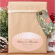 This oval wedding sticker features a pink and coral background with a light damask overlay. A solid coral color on the bottom half of the sticker features customizable text for you to add the names of the bride and groom and their wedding date.