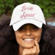 This design features the word "Bride Squad" adorned with interlocking cowboy hats, flowers, and a champagne glasses and bottle bursting with splashing hearts.