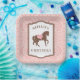 This cowgirl birthday plate design features a rope border with a personalized label. In the center of the label is a horse with the words "8th birthday". The background is a pink bandana pattern. You can personalize with a name and date. The perfect way to dress up your table for your cowgirl party. YeeHaw!