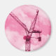 a dramatic pink photo of a tower crane against a cloudy summer sky.