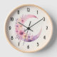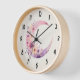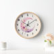 A clock with a lovely illustration featuring a soft pink and purple crescent moon. Pretty pink and yellow wildflowers adorn this celestial body.