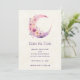 Save the date card with a lovely illustration featuring a soft pink and purple crescent moon. Pretty pink and yellow wildflowers adorn this celestial body.