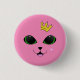 This round pink button features a cartoon cat face with a small gold crown on its head. The cat has big green eyes, a small pink nose, and a small pink heart on its cheek. The background is a solid pink color.