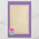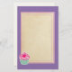 Graphic art / illustration of a yummy pink cupcake with swirls of icing on top and a cute, hot pink, polka dot cherry. The base is green and white stripes. This writing paper has a purple background with a central writing area in a parchment color with a soft pink double border.