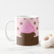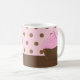 A yummy looking chocolate cupcake is topped with fluffy pink frosting and is on a light pink background with brown polka dots.