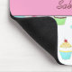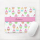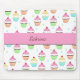 This mouse pad is done in pastel colors with pink being the main color. It has colorful little cupcakes all over it. A pink stripe runs through the center with custom text inside it.